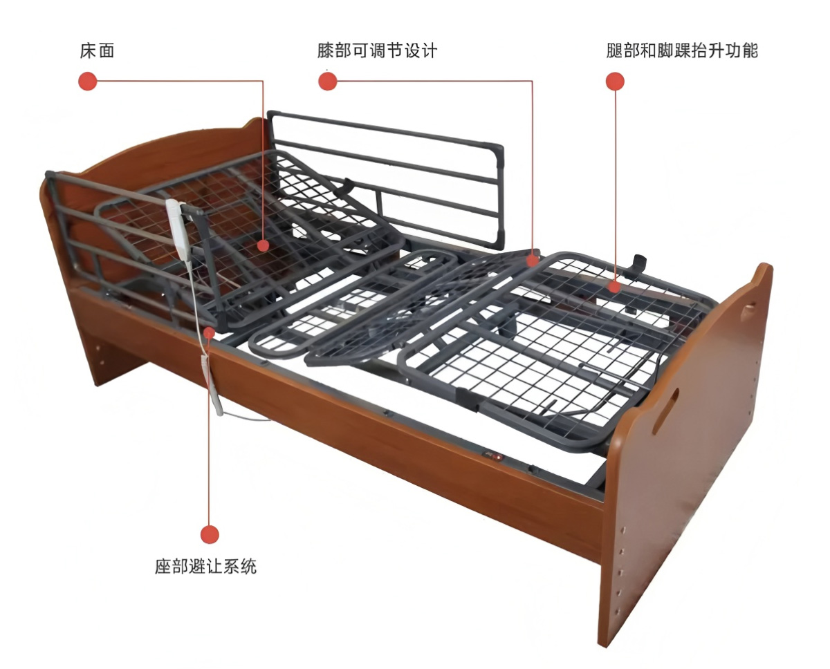 電動(dòng)床膝部床面設(shè)有兩檔可供調(diào)節(jié),從而滿(mǎn)足不同身高使用者的人體需求。